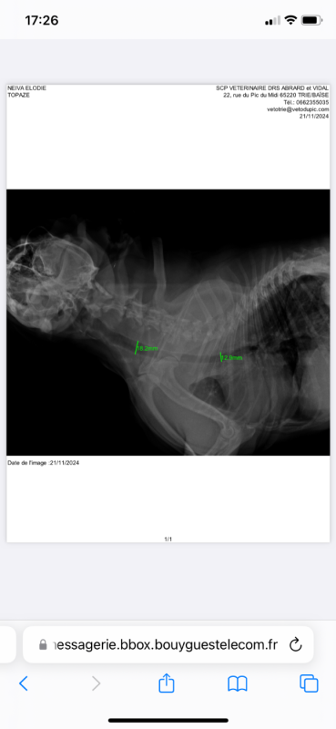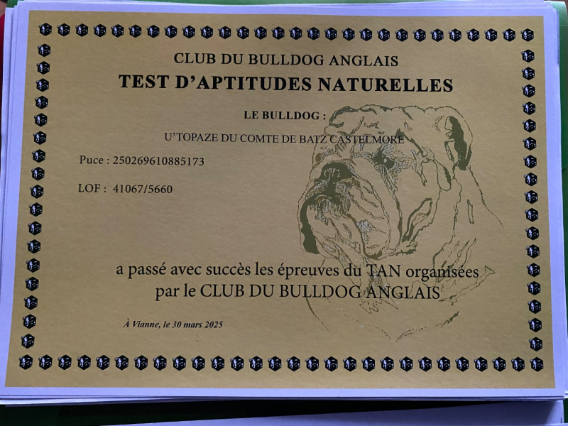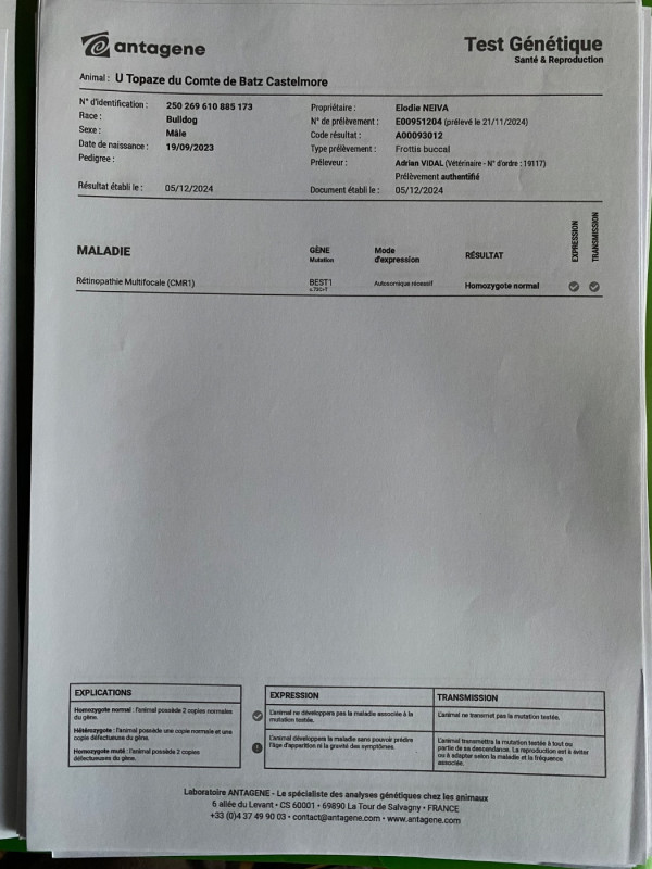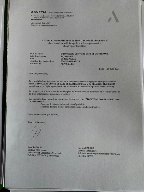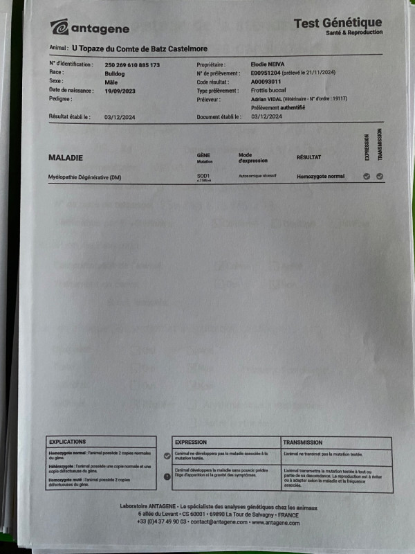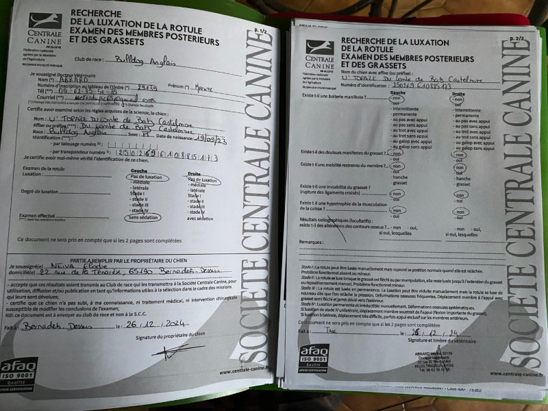 ADN : Enregistré SCC BREATH : Ok HUU 1.1 : Indemne Hyperuricosurie Hypoplasie de la trachée : Indemne: radio a l’appuie ( mesures de 13 à 18 mm ) Luxation des rotules et grassets : Indemne ( PL-0 ) Myélopathie dégénérative : Indemne Sténose pulmonaire et autre cardiopathies : Indemne ( PS-0 ) Test de Comportement ( TC ) : Ok |